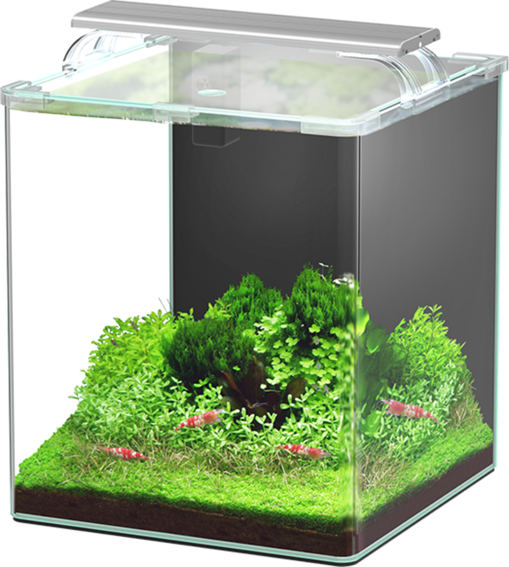 Il set Essential comprende, oltre all'acquario, anche una base ammortizzante che protegge il fondo dell'acquario. Nel set è compreso anche un film nero autoadesivo per lo sfondo dell'acquario, per creare la giusta atmosfera.