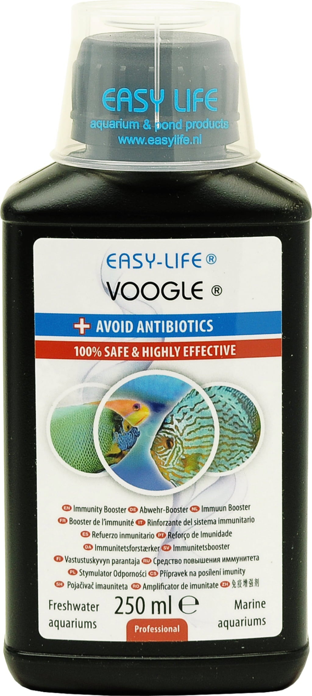 Voogle è un prodotto innovativo che supporta la salute dei pesci e rafforza il sistema immunitario, riducendo al minimo l'uso di antibiotici. Ogni pesce ha un sistema di difesa naturale contro gli agenti patogeni. Il trasporto, l'acqua sporca o un gran numero di agenti patogeni presenti nell'acqua causano un enorme stress che intacca il sistema immunitario. La membrana mucosa, le branchie e le pinne in particolare diventano più suscettibili a malattie come la malattia dei puntini bianchi, funghi e altri tipi di infezioni. Utilizzando Voogle settimanalmente, i tuoi pesci rimarranno naturalmente protetti e ridurrai il rischio di vari agenti patogeni.