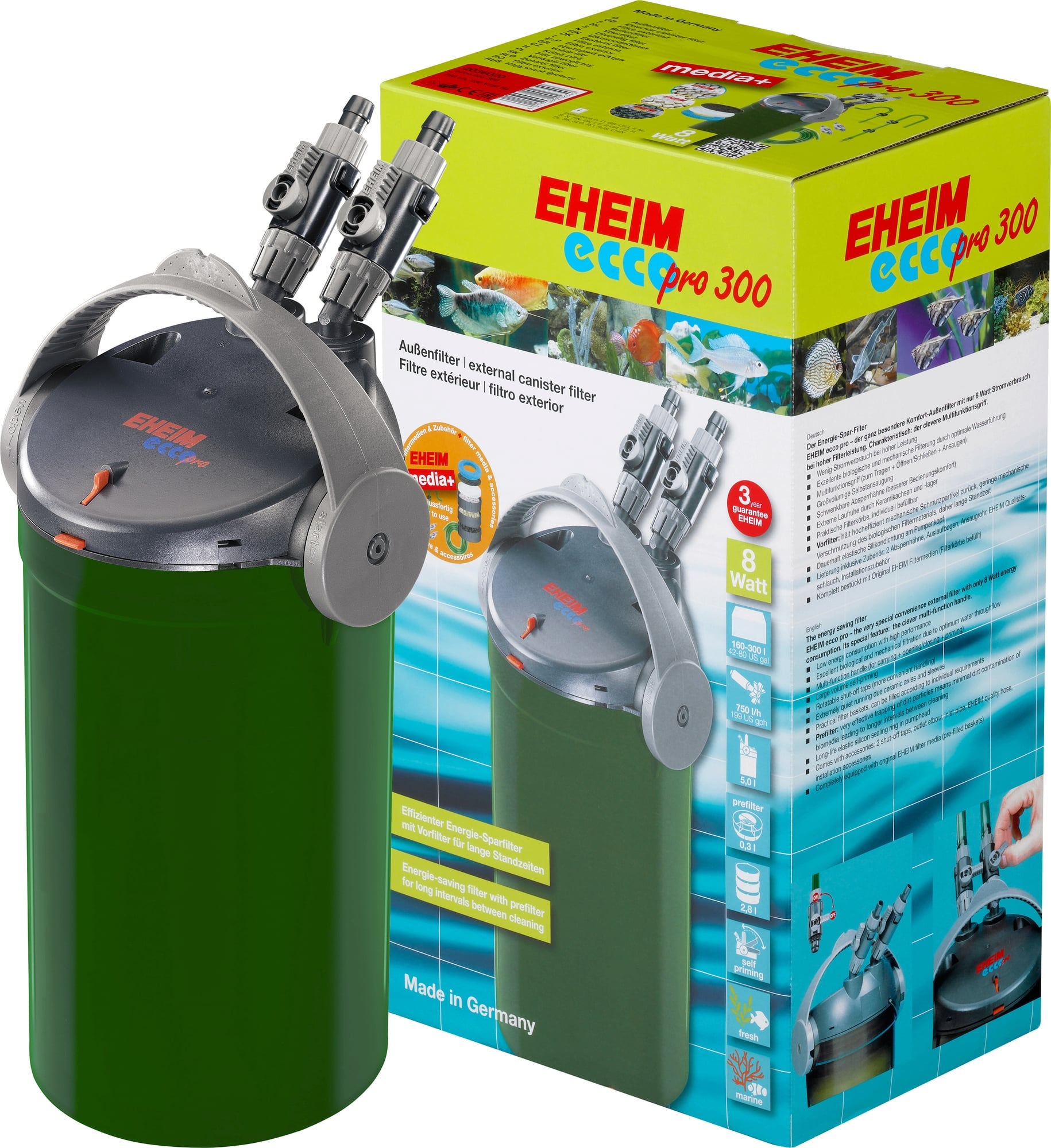 Il filtro esterno ecco pro combina uno straordinario concetto di risparmio energetico, prestazioni e comfort: il filtro esterno consuma infatti solo 5 watt con una capacità della pompa di 600 litri all'ora, o 8 watt con 750 litri. La caratteristica leva multifunzione unisce invece tre compiti contemporaneamente: trasporto, apertura/chiusura e aspirazione. A ciò si aggiungono i rubinetti di chiusura girevoli, i pratici cestelli filtranti e il funzionamento particolarmente silenzioso grazie ai componenti in ceramica. Il prefiltro aggiuntivo garantisce una maggiore durata delle masse filtranti. La guarnizione in silicone sulla testa della pompa invece si distingue per la sua resistenza.