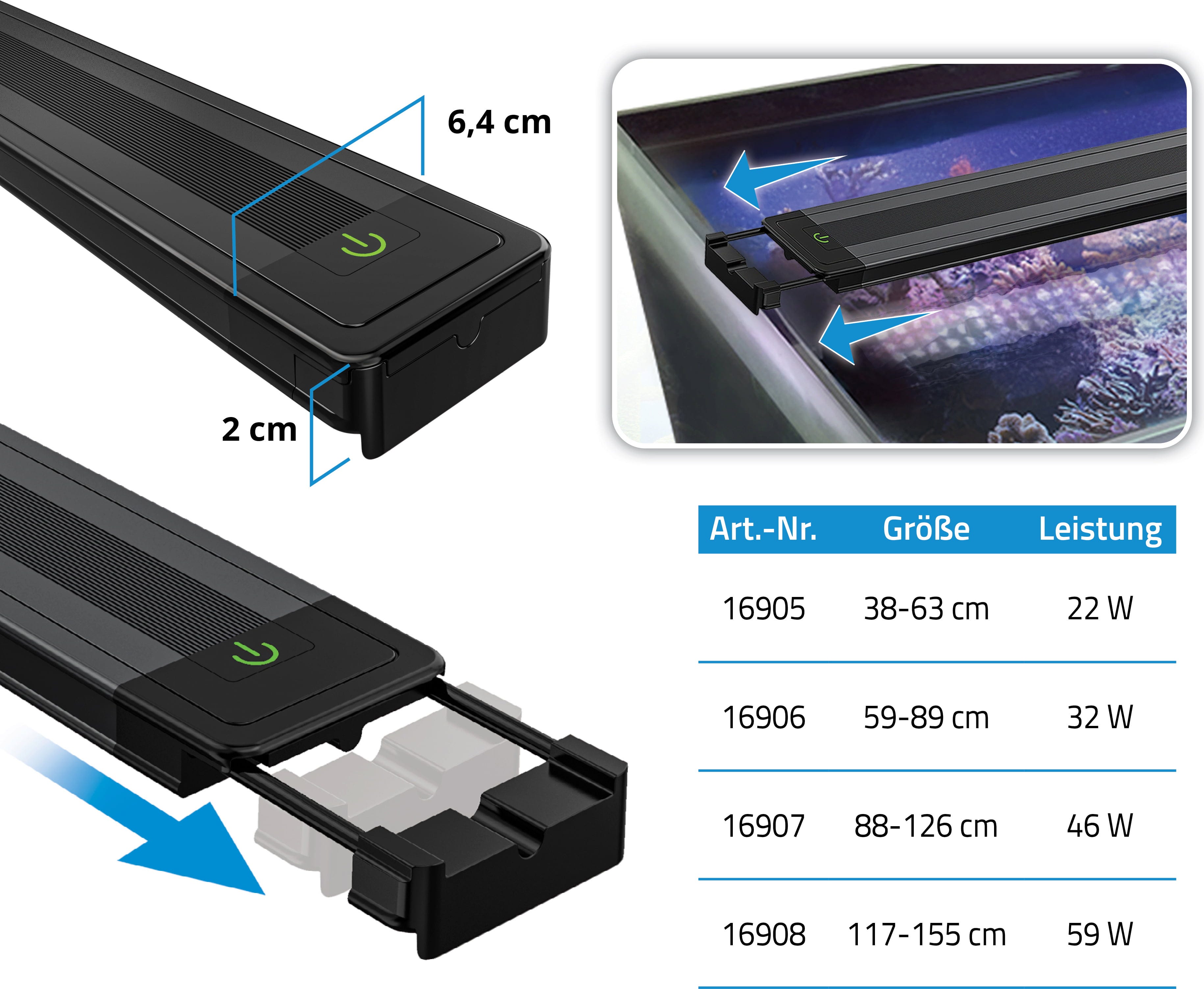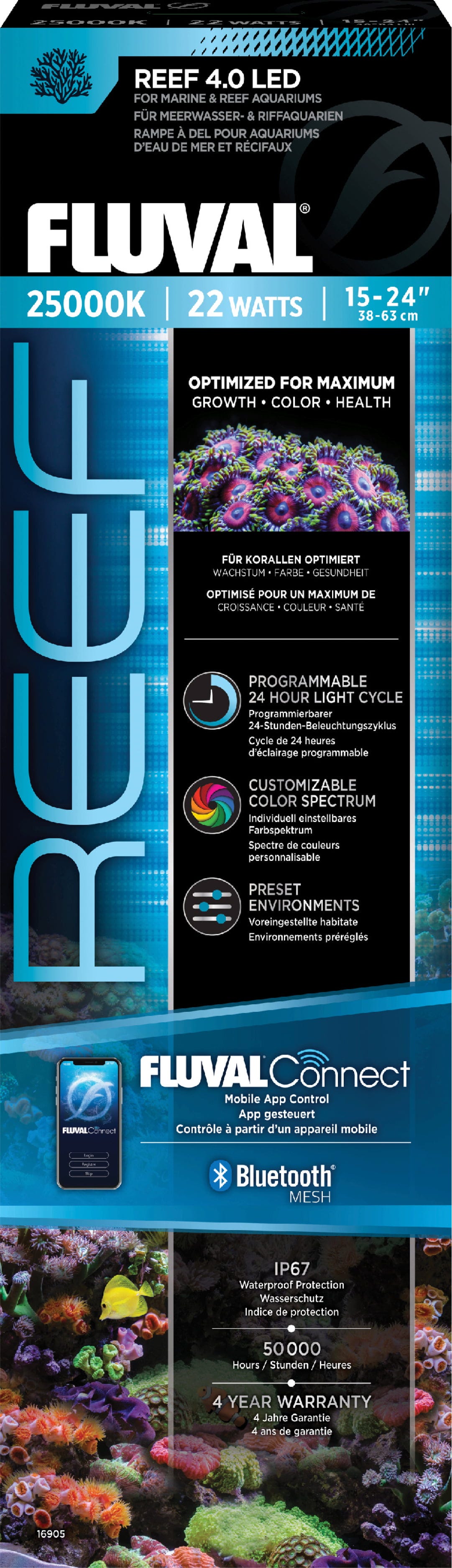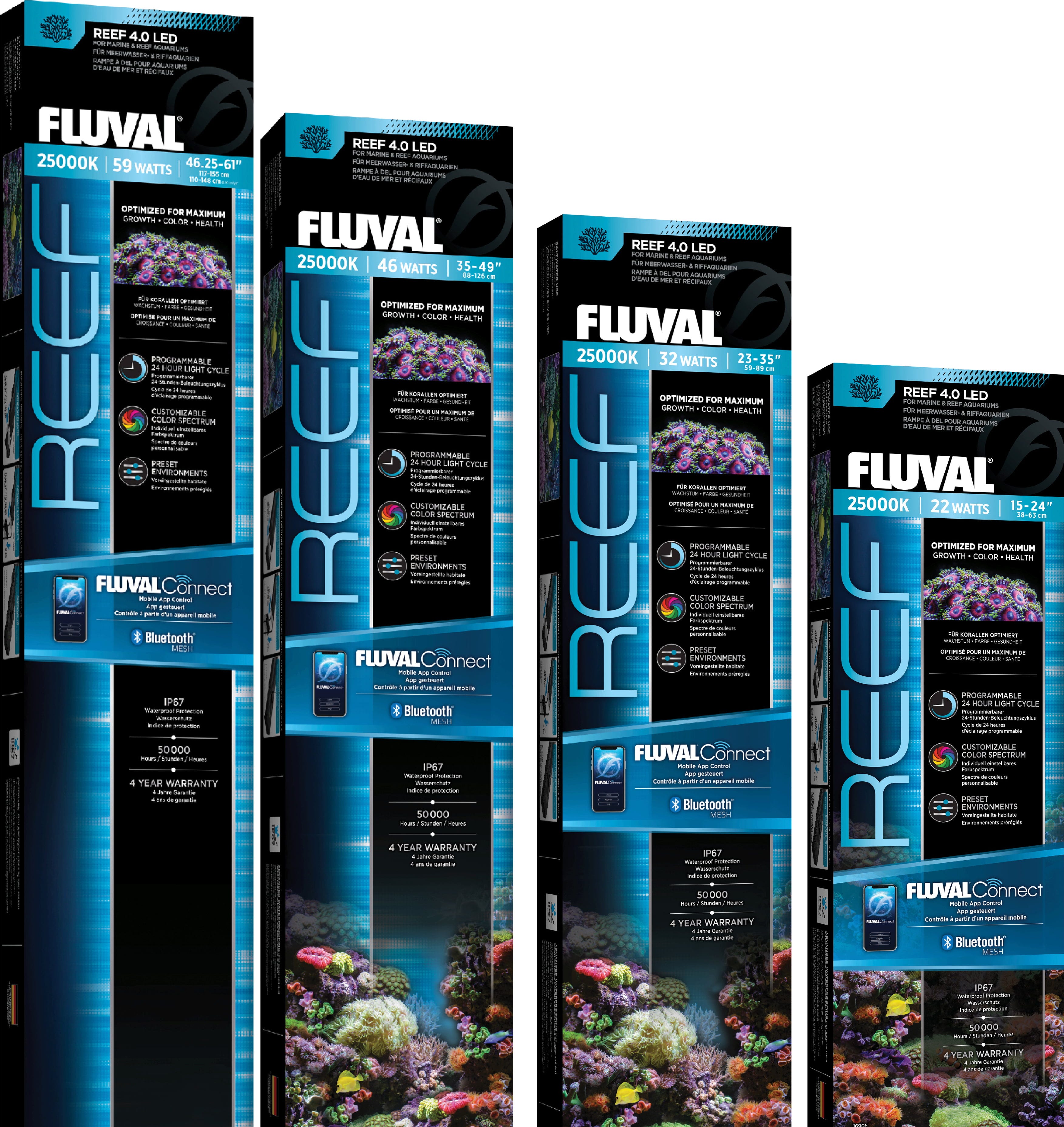 Tramite l’app FluvalConnect puoi controllare in modo indipendente tutti i canali di colore e simulare cicli luminosi realistici o condizioni atmosferiche variabili. La speciale sigillatura della lente in vetro protegge la plafoniera dall’ambiente aggressivo dell’acqua marina e dall’umidità, garantendo affidabilità nel tempo. La staffa a ponte regolabile in altezza inclusa consente un posizionamento preciso sopra l’acquario, assicurando una distribuzione ottimale della luce anche nelle zone più profonde.