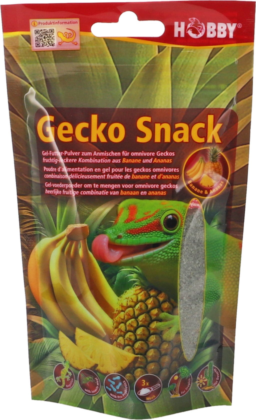 Gecko Snack di Hobby è una polvere per la preparazione di un alimento in gel a base di frutta, specificamente sviluppato per gechi onnivori. È adatto come integratore alla dieta di base e può essere utilizzato in aggiunta agli insetti vivi.