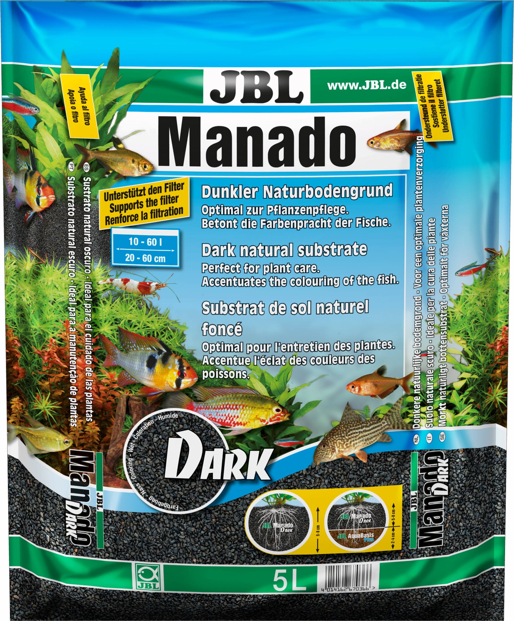 JBL Manado è ideale per la cura di pesci e invertebrati, poiché non rilascia sostanze inquinanti indesiderate nell'acqua. I granuli arrotondati proteggono i sensibili barbigli dei pesci che vivono sul fondo. Il substrato naturale attiva la flora del terreno ed è ideale per la cura delle piante. Il tampone di elementi nutritivi con effetto batteria (rilascia elementi nutritivi fino ad esaurimento e si può poi ricaricare mediante una nuova fertilizzazione) è neutro all’acqua e smussato. Di conseguenza è particolarmente idoneo per le specie di pesci scavatori come il pesce gatto e il cobite.