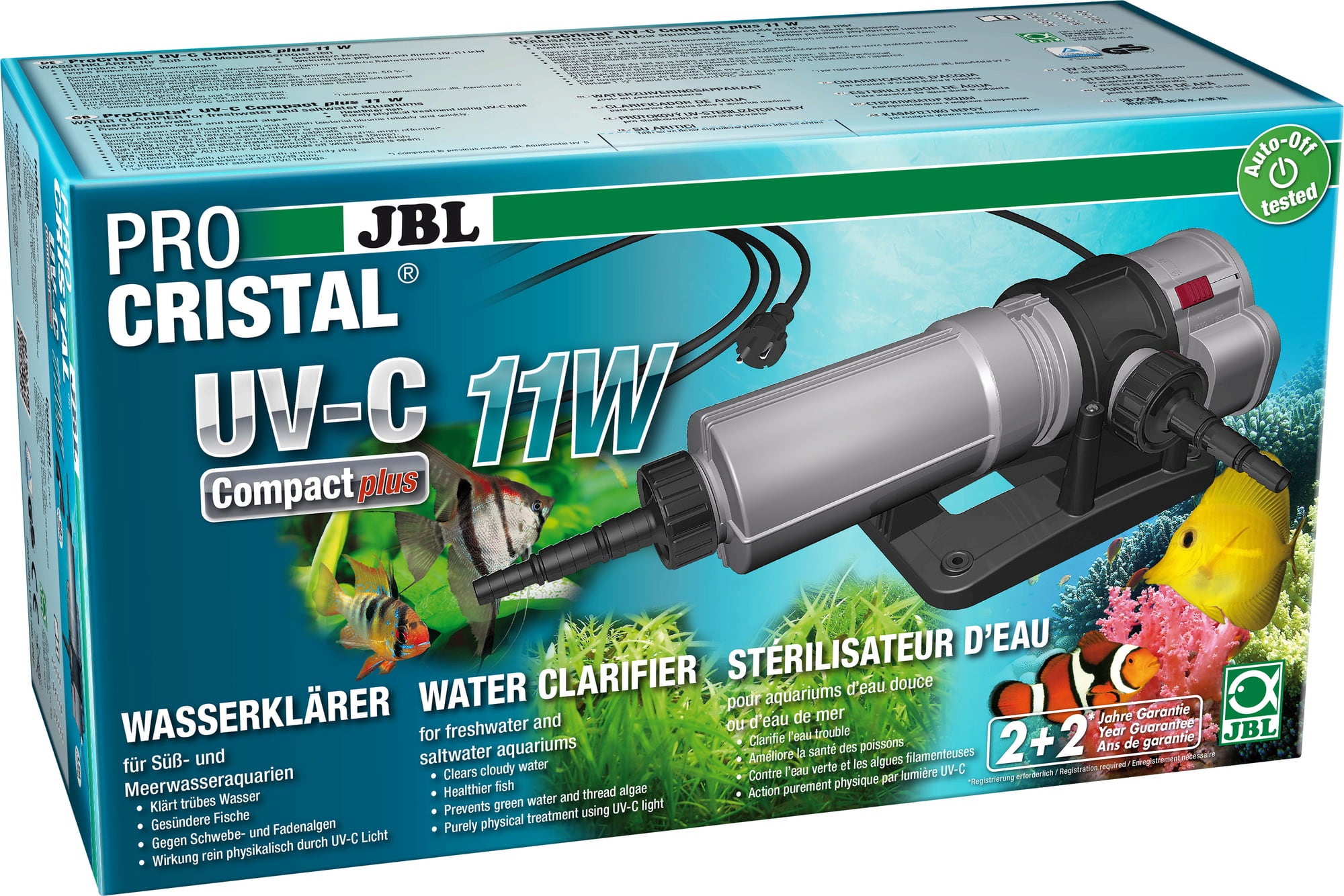 Scarse condizioni di illuminazione, una fertilizzazione eccessiva o un eccesso di nutrienti possono avere effetti negativi sull'acqua dell'acquario e favorire la proliferazione delle alghe. Le alghe galleggianti portano a una torbidità verde, mentre i batteri a una torbidità biancastra. Lo sterilizzatore d'acqua JBL rimuove gli intorbidamenti dovuti a batteri e alghe fluttuanti. L'acqua dell'acquario scorre attraverso la custodia robusta e resistente ai raggi ultravioletti dello sterilizzatore. La radiazione UV-C uccide i batteri come anche altri germi patogeni e le alghe fluttuanti presenti nell'acqua. L'efficienza di questo sterilizzatore è particolarmente alta, dato che il bulbo di vetro è rivestito di una pellicola levigata e riflettente di acciaio inossidabile che riverbera la radiazione UV raddoppiandone l'efficienza. Può avere anche effetti positivi nella rimozione di alghe persistenti come le filamentose perché ne uccide in gran parte le spore.