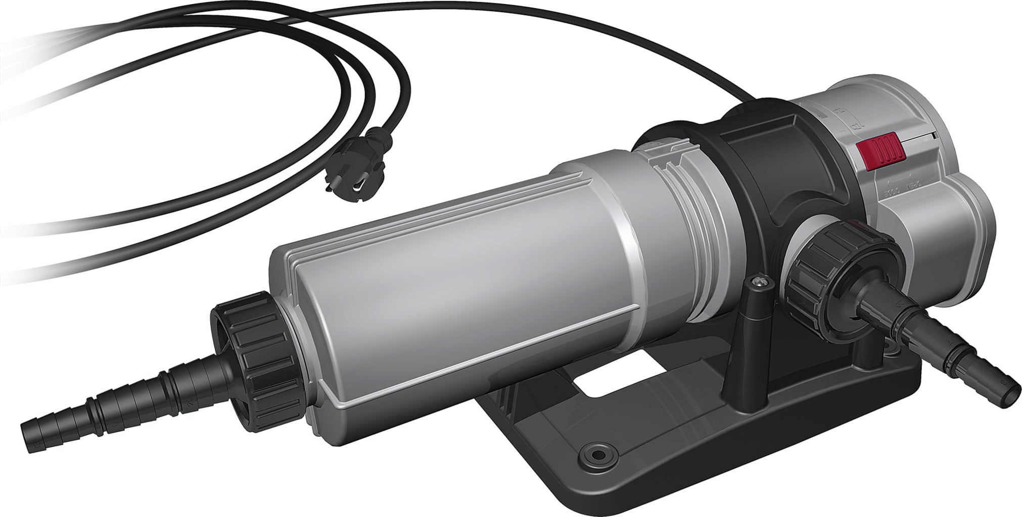 Collegare lo sterilizzatore al filtro esterno o a una pompa d'acqua. L'angolo di 90° permette di installarlo in ogni posizione desiderata.