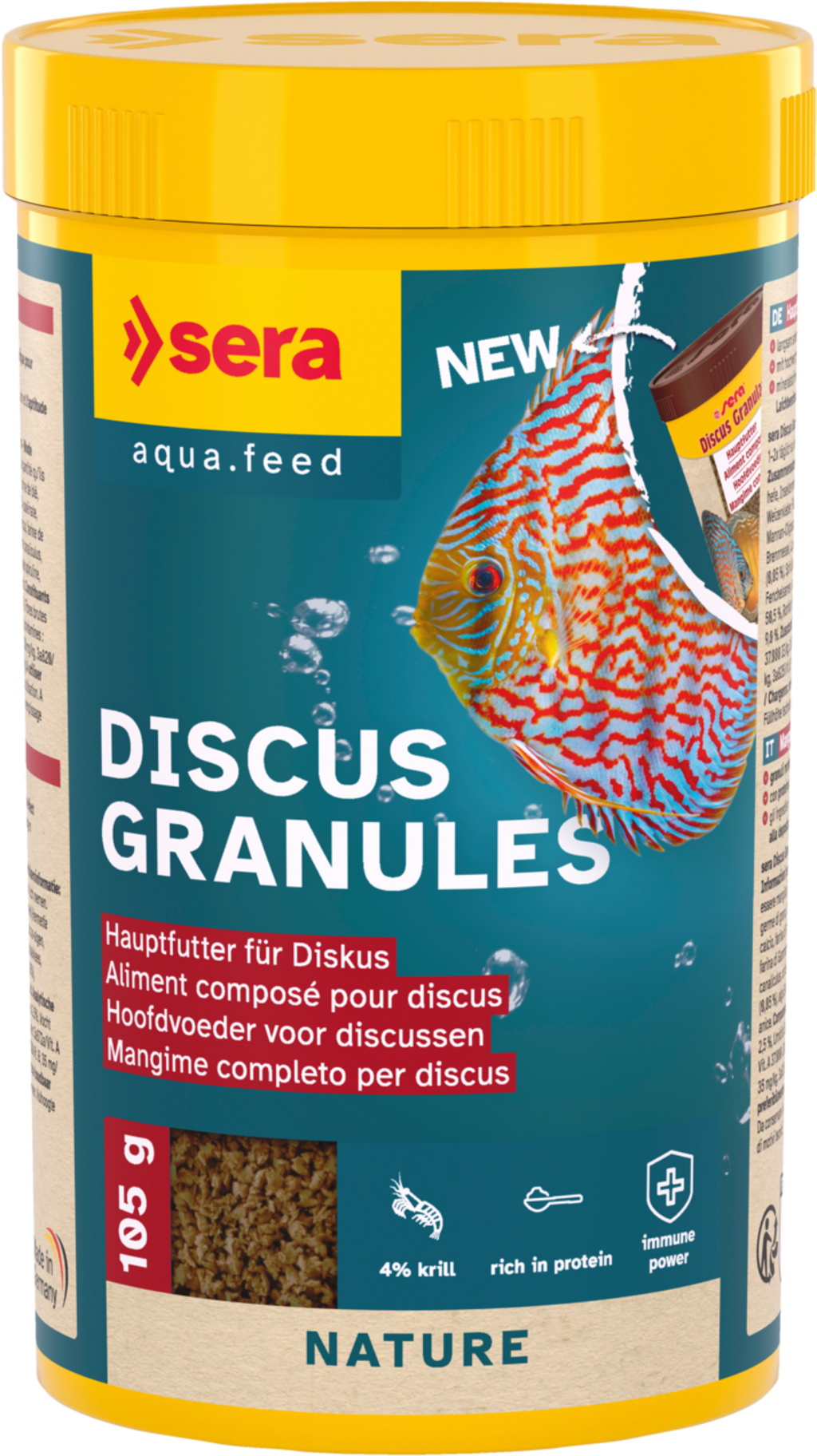 Sera Discus Granulat è un mangime completo in granuli per pesci Disco e altri pesci particolarmente esigenti negli acquari di acqua dolce.