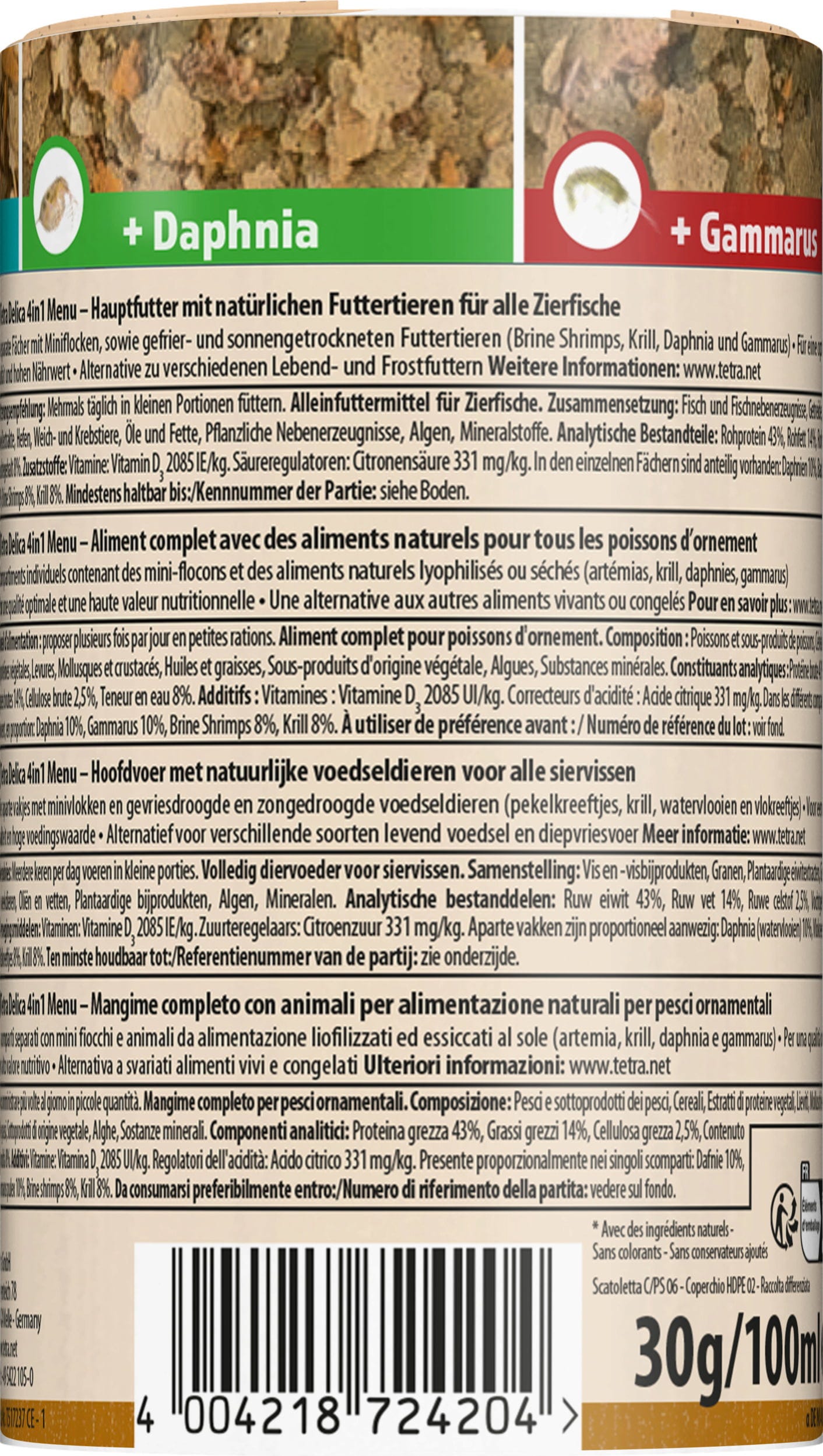 Questo mangime suddiviso in 4 diversi scomparti è un mix in scaglie arricchito con Gammarus, Artemia salina, Daphnia e larve di zanzara.